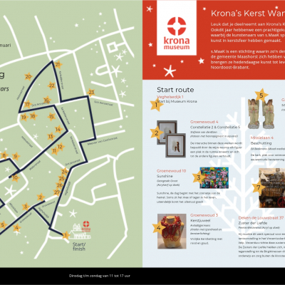 Kunstenaars van s.MaaK exposeren hun kunstwerken in kerstsferen, welke u kunt bewonderen tijdens het lopen van Krona's KerstWandeling.Start in Museum Krona, Uden. U ontvangt aldaar de route van de wandeling.