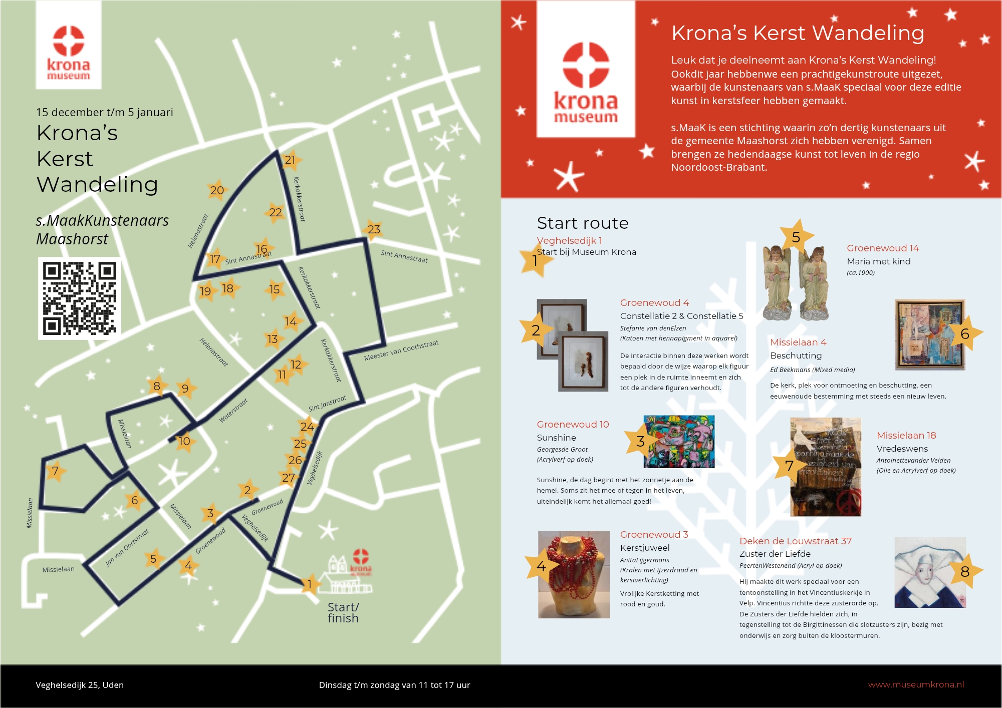 Kunstenaars van s.MaaK exposeren hun kunstwerken in kerstsferen, welke u kunt bewonderen tijdens het lopen van Krona's KerstWandeling.Start in Museum Krona, Uden. U ontvangt aldaar de route van de wandeling.